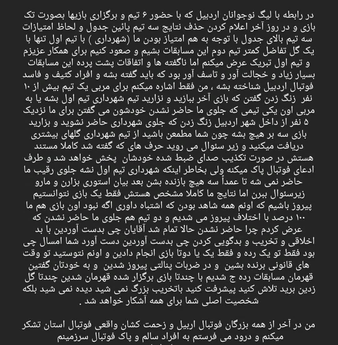 و در نهایت باید اشاره شود که ادعاهای یک مربی در دلنوشتهاش باید مورد توجه هیئت فوتبال استان و کمیته انضباطیاش قرار گیرد. ادعای انجام یافته در ارتباط با تشویق برای عدم حضور و رایزنی برای به زیر کشیدن یک تیم و کمک به صعود تیم دیگر موردی نیست که بیتفاوت از کنار آن عبور شود. ورود قاطعانه کمیته انضباطی و رسیدگی به موضوع و اعلام نتیجه بررسی میتواند در آینده از بروز چنین اتفاقاتی جلوگیری نماید.
