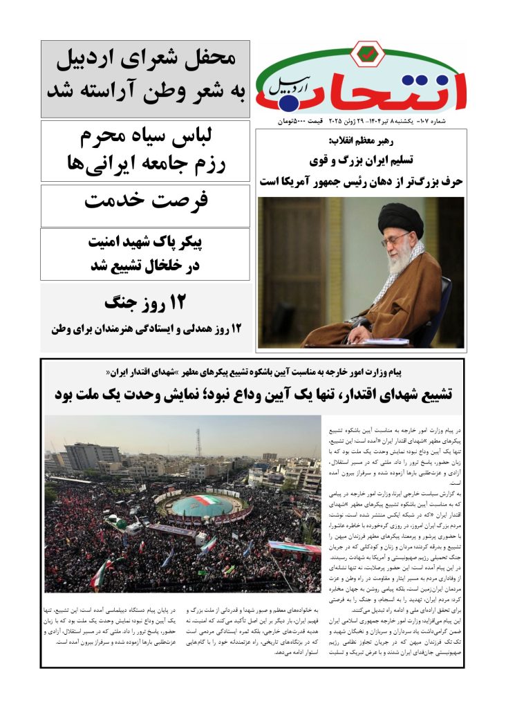 شماره 107 هفته نامه انتخاب اردبیل در هشت صفحه منتشر شد. شماره 107 نشریه انتخاب اردبیل